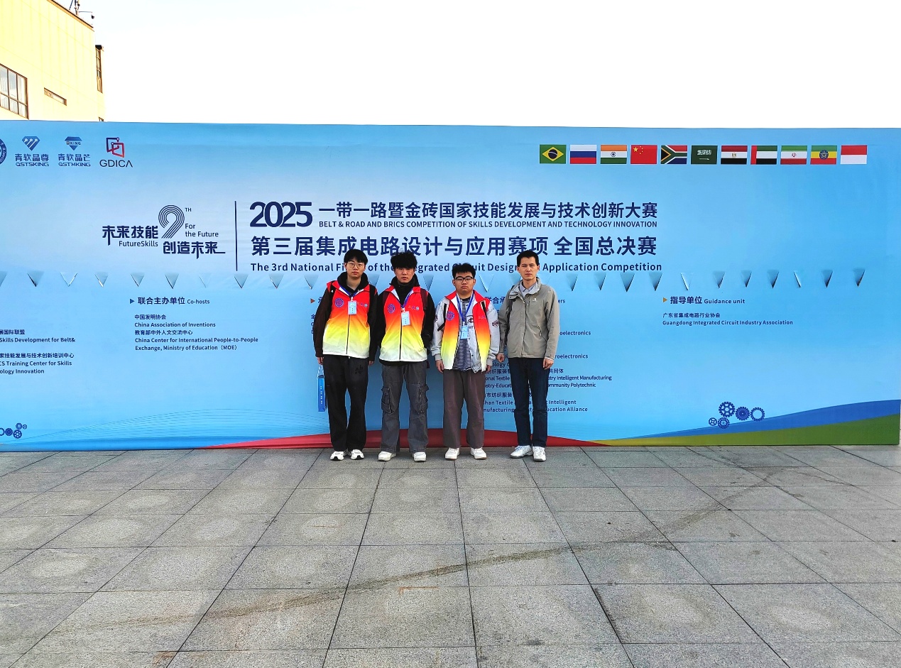 2025年11月28日至30日,2025“一带一路”暨金砖国家技能发展与技术创新大赛“集成电路设计与应用”赛项全国总决赛在广东职业技术学院成功举行。本次比赛汇聚了来自全国各地182支高校代表队,经过激烈角逐,我校智能制造与交通学院谢子昊、苏祥晨、杨成浩学生团队凭借扎实的专业功底、出色的创新能力和稳定的临场发挥,斩获全国总决赛二等奖的优异成绩,郑小朋、李刚老师获评“优秀指导教师”。